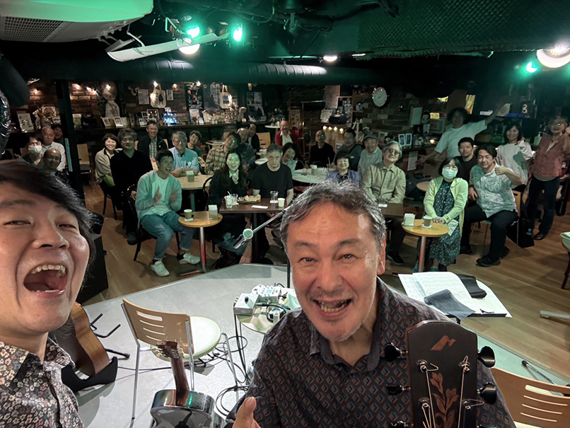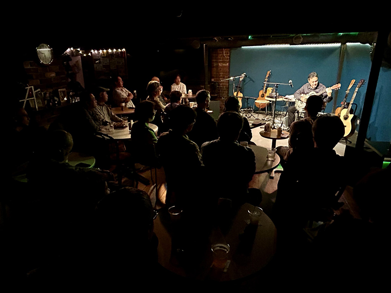 (→)村上ライヴは、ギター4本担いで巡業していた時代から、長年ずっとお世話になっている駅前の「楽屋」。青山マスターは、その昔1993年に出した教則ビデオ (VHS)「すぐ弾けるカントリー・ブルース・ギター」で練習してくださったこともあるんです。写真はカウンターの中から青山さんが撮ってくれた1枚。