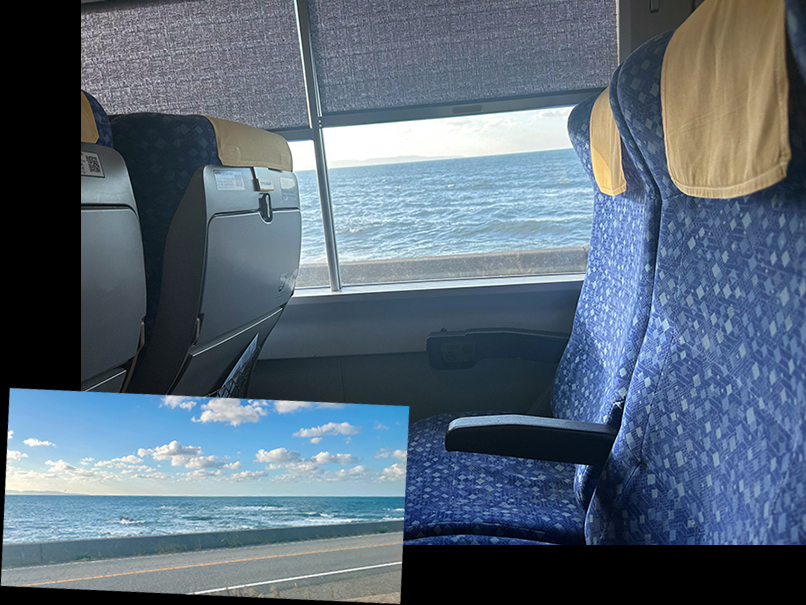 (←)秋田から村上へは特急「いなほ」で一直線。車窓には日本海の絶景が広がります。普段わーわーやっている私ですが、実はこういった風景を眺めながらの、のんびりした時間も大好きなんです。