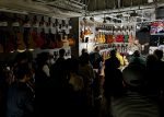 (→)巡業初日の「ドルフィンギターズ 福岡店」でのインストアライヴの様子 (その1)。高級ギターがズラリ展示された店内、そして後方のプロジェクターにはステージが映し出されるといった素敵な環境でのライヴでした。たくさんのご来場、本当にありがとうございました!