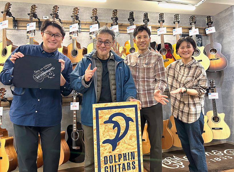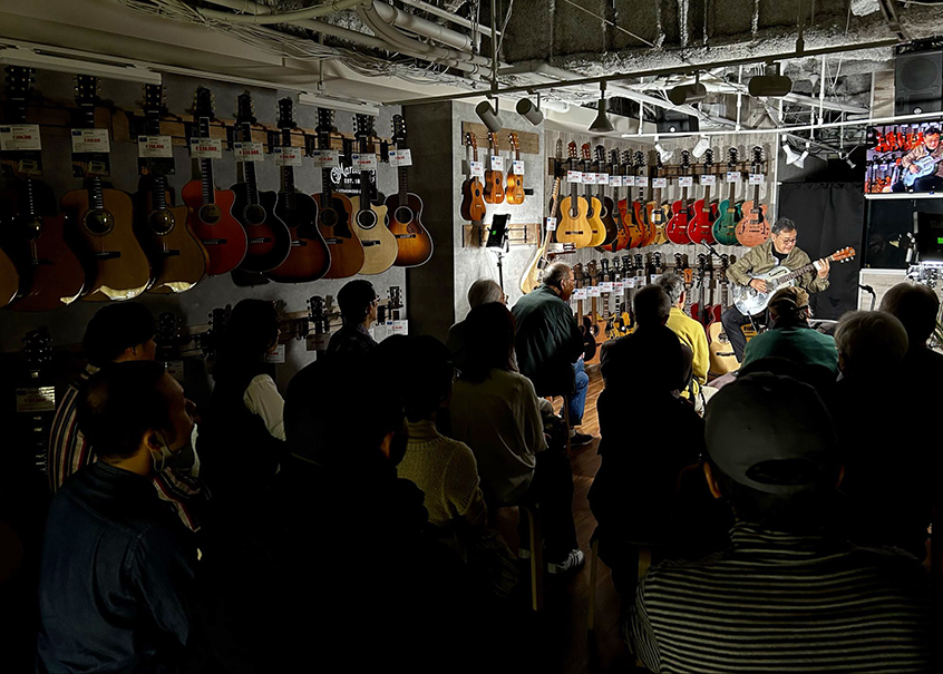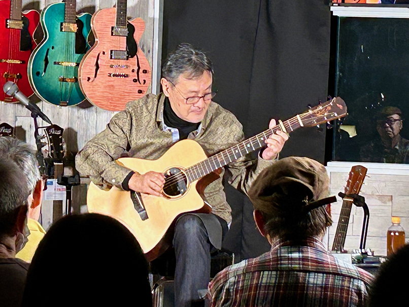 (←)「ドルフィンギターズ 福岡店」でのインストアライヴの様子 (その2)。私の弾いたギターは、写真で弾いているMorris SC-145U、Morris SC-123U、そしてリゾネーター・ギターのNational Style-Nの3本。