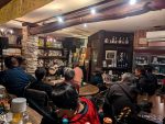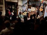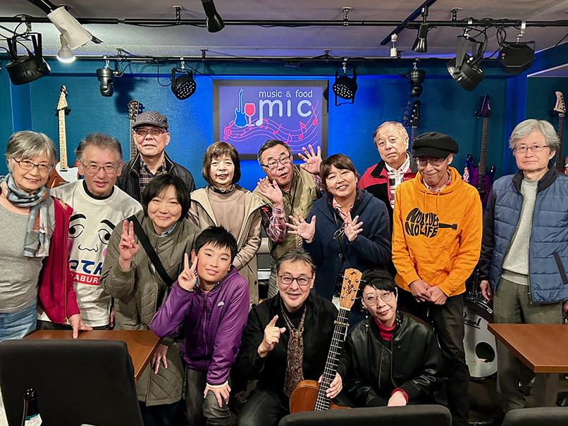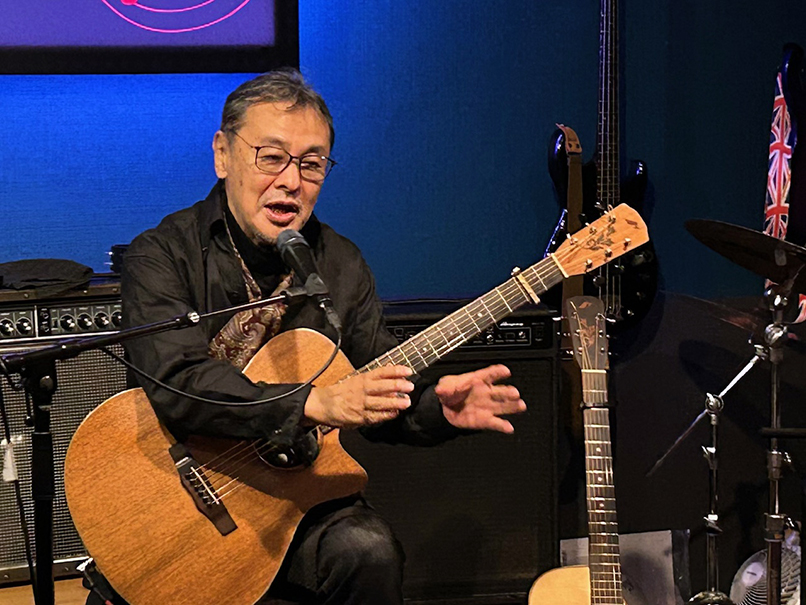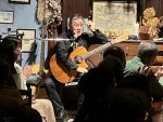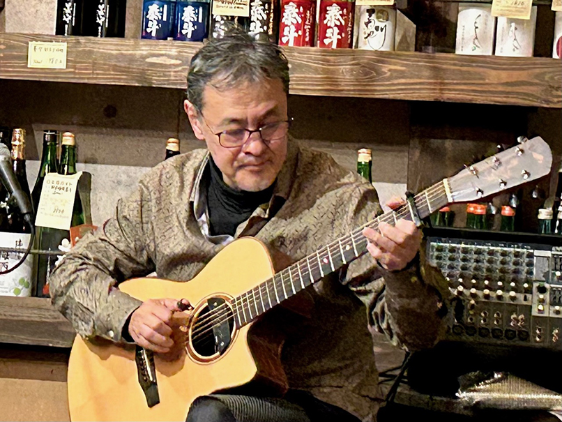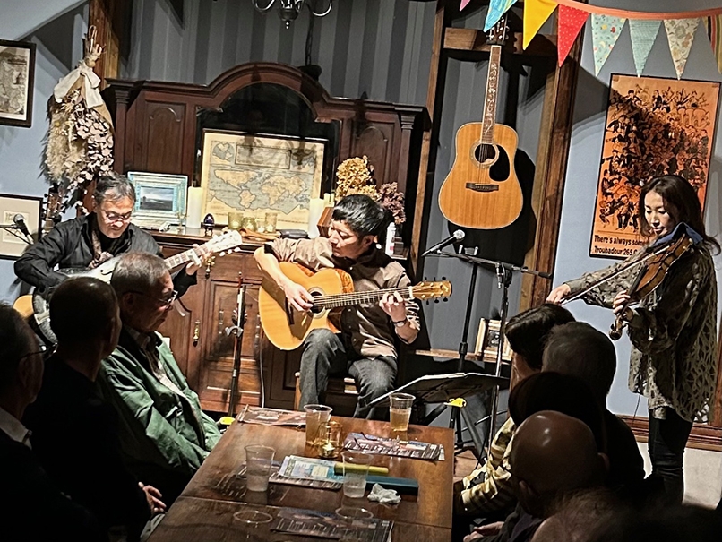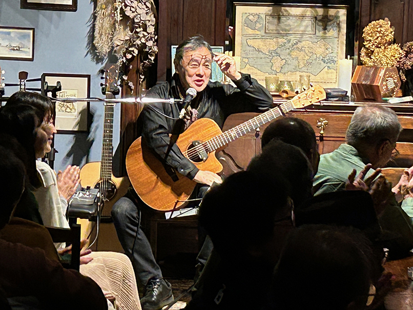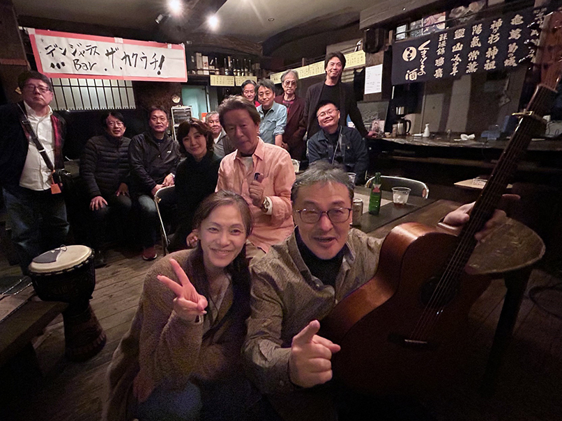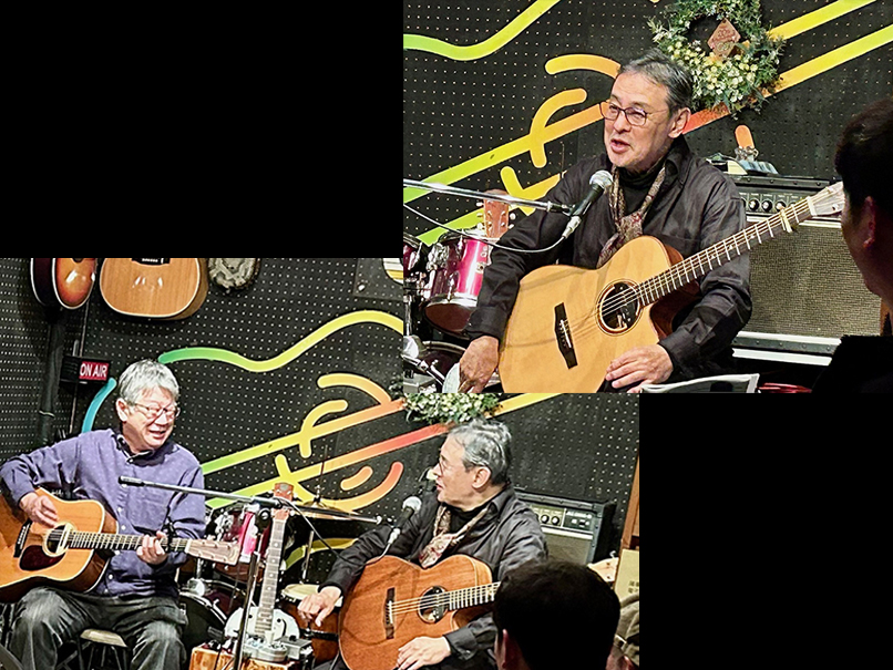 (←)オープニングを務めてくれた道本さんとは、私が20代だった頃からかれこれもう40年もの付き合いなんです。大学を辞めてバイトしながらのギター小僧だった私と、片や大学をちゃんと卒業して地元へ戻って活動…道は違えどこうやって今でもライヴでご一緒できることが嬉しいです。終演後は、いつものように残ってくださった皆様、マスター、ママさんと大盛り上がりの打上げでした。打上げの最後の方で、ジャイアント馬場さんとアントニオ猪木の話になって、火が付いた私がディープなトークを繰り広げてしまい、大変失礼しました (笑)。