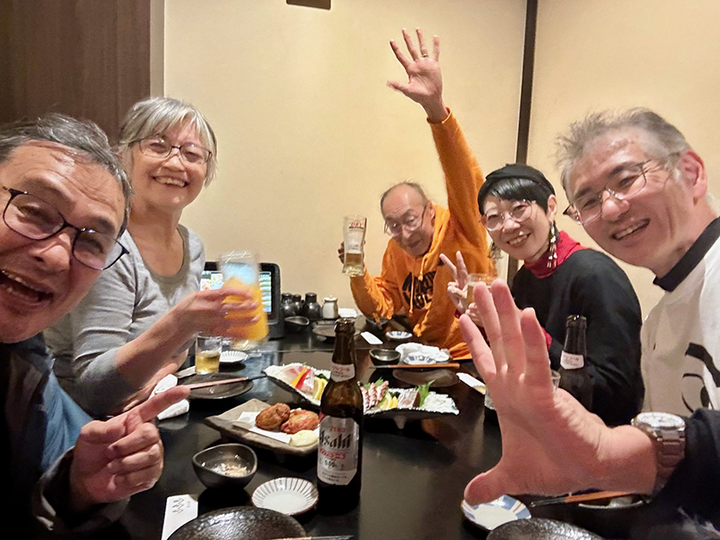 (←)Tシャツ、グラス、ハンドタオルなどでお馴染みのイラストレーター“雨☔あまやどり”さんご夫妻、昔から応援してくれている林田さんらと近所の居酒屋で一杯。長崎は食文化も独特で、ここでしか食べられない美味しいものがたくさんあるんです。
