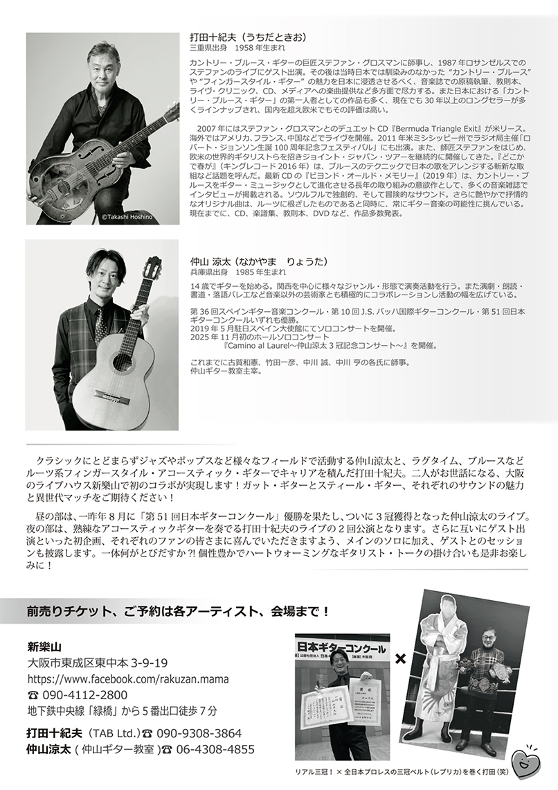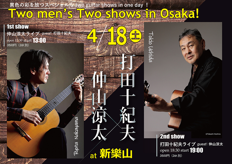 初日の4/18(土)の「新樂山」は【Two men’s Two shows in Osaka】と称し、昼の部「仲山涼太ライヴ」、夜の部「打田十紀夫ライヴ」の2部構成で開催、それぞれのライヴにゲスト出演するという企画になっています。夜の部「打田十紀夫ライヴ」