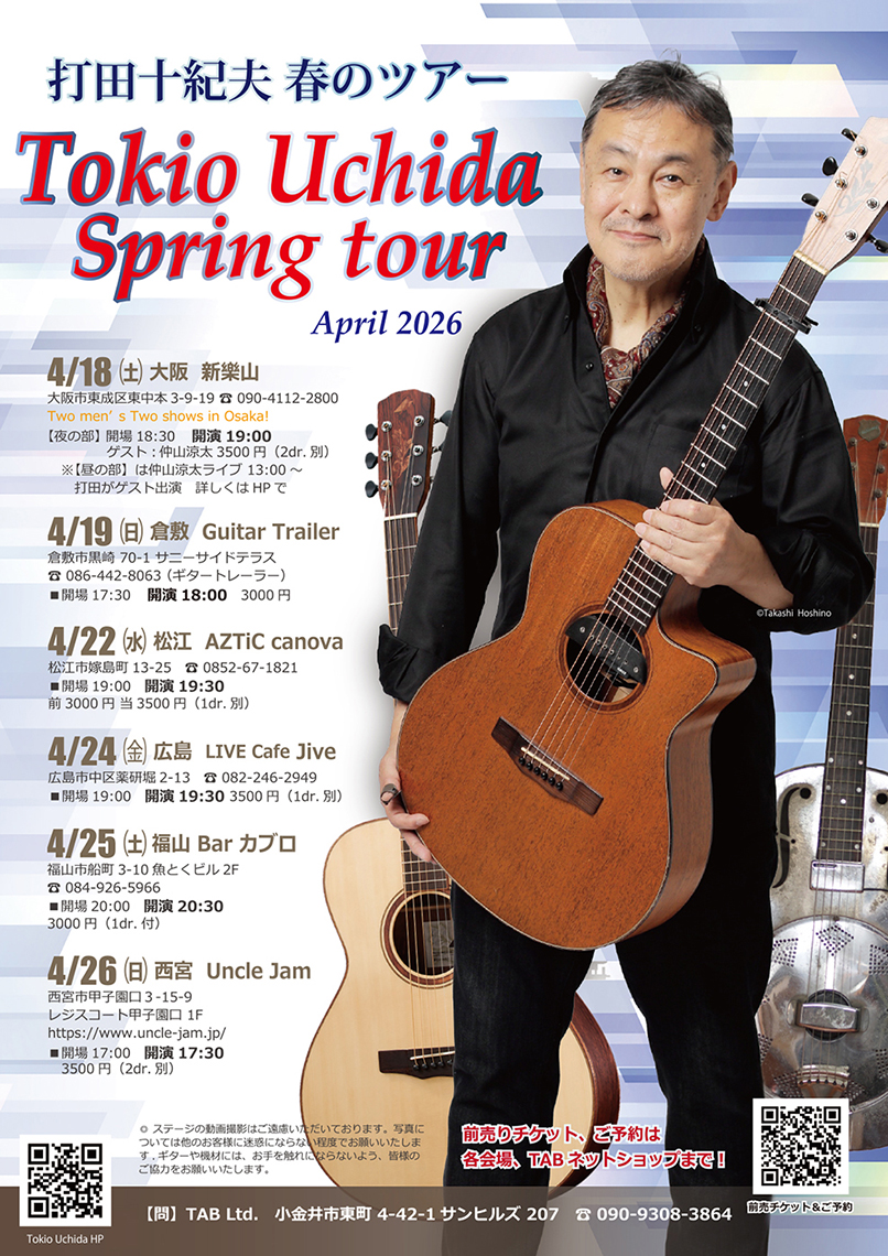 さて、恒例の春のツアー、4月の「打田十紀夫 関西~中国地方ツアー2026」(4/18-26) の詳細が決まりました❗️ 大阪・倉敷・松江・広島・福山・甲子園口とぐるり巡業する、今年最初のロングツアー…今から楽しみです✨
