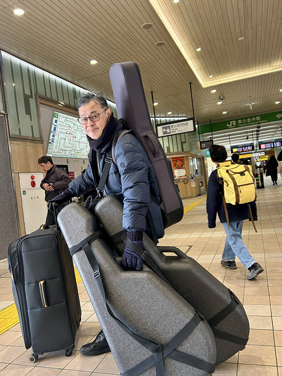 (→)ギター3本と大きなスーツケースという、いつもの出立ちで東小金井駅を出発。東小金井 → (JR中央線) → 東京 → (新幹線「はくたか」) → 金沢 → (IRいしかわ鉄道) → 松任という乗り継ぎで、4時間強かけてポンポロプーのある松任まで向かいます。