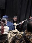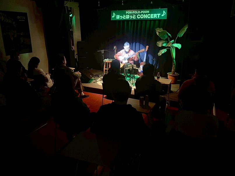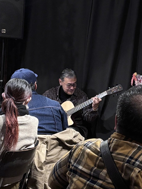 (→)石川県白山の「ポンポロプーF&Pホール」でのライヴの様子:その1(撮影:コジー)。オーナーの島崎さんには、「ポンポロプー」として独立される前から、もう26年もの長い間お世話になっています。今では「ポンポロプー」は、楽器の品揃えはもちろん、隣接の新築建物で音楽教室も幅広く展開され、ギター・ファン、音楽ファンにとっての北陸の聖地になっています。