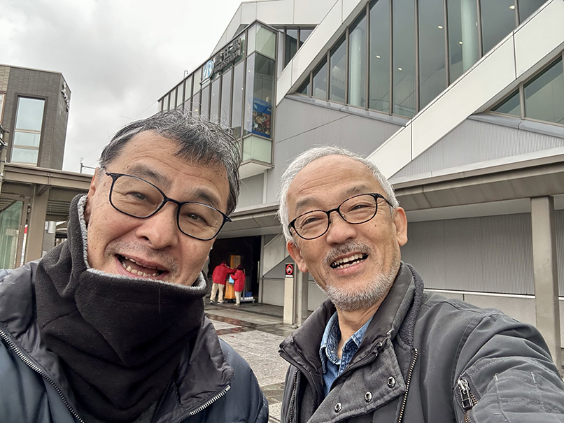 (→)翌日大阪へ向かう朝、雨が強かったので、島崎さんがホテルから松任駅まで車で送ってくれました。その際に記念写真パチリ! 島崎さん、今回も大変お世話になりました! 頑張って生き延びますので (笑)、今後ともどうぞよろしくお願いします。