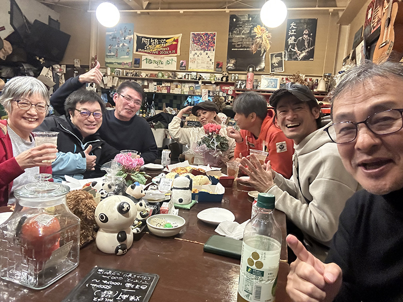 (→)残ってくれた方々との打上げ写真。今ではすっかりアルコールを飲まなくても酔えるようになった私 (笑)。私の隣は、3つの権威あるクラシック・ギター・コンテストで優勝した仲山涼太クン。いわばギター界の三冠王者。でも、ジャンボ鶴田よりいい男ですね (笑)。2年前の新樂山での脳出血ライヴでもご来場してくれてて、今回“復活”をお見せできてよかったです。